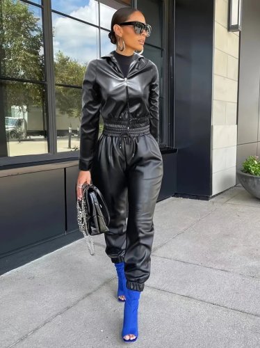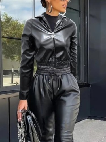 • Kadın uzun kollu kapüşonlu ceket bel ve paçası lastikli pantolon ikili deri takım