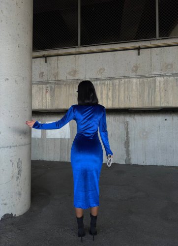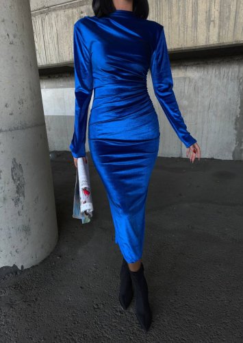 Kadın uzun kollu yarım balıkçı yaka büzgü detay kadife kumaş elbise
