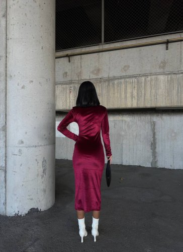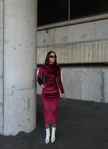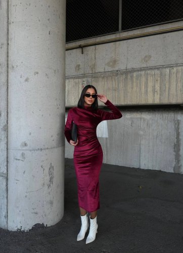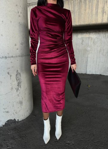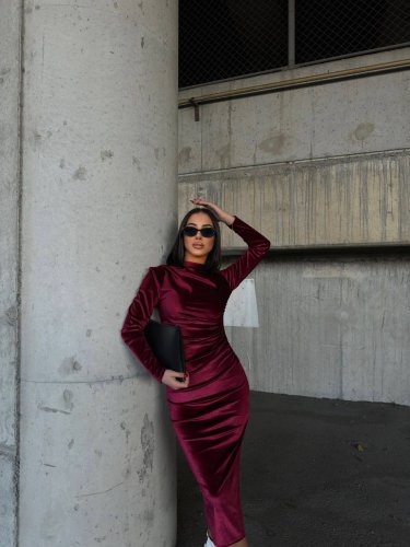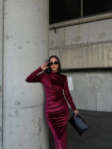 • Kadın uzun kollu yarım balıkçı yaka büzgü detay kadife kumaş elbise